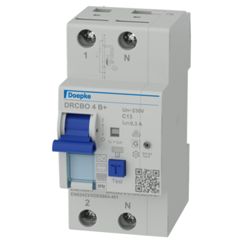 RCBO vereinen Fehlerstrom- und Leitungsschutzschalter in einem Gerät (FI-/LS-Kombination). Somit eignen sie sich ideal für Ihre Verteilungen auf engem Raum. Das Bemessungsschaltvermögen der Baureihe DRCBO 4 liegt bei 6 kA. Schalter des Fehlerstromtyps B+ sind allstromsensitiv und bieten einen vorbeugenden Brandschutz von 420 mA bei Frequenzen bis 20 kHz. Mit der Auslösecharakteristik C gewährleisten die Geräte verlässlichen Schutz für Ihre Stromkreise mit Verbrauchern, die höhere Einschaltspitzen erzeugen. Geräte in Standardausführung sind für Stromkreise mit 230 V bzw. 400 V bei 50 Hz ausgelegt.