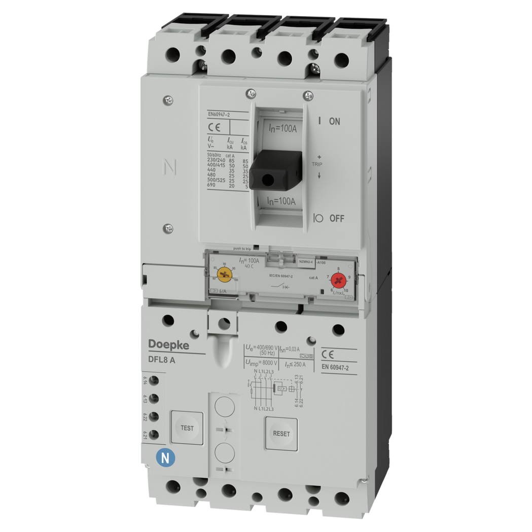 The DFL 8 is a circuit-breaker with residual current trip (CBR). It is used in large cranes on building sites, in hospitals with MRI scanners, or in complex supply systems with high shortcircuit current in purpose-built buildings and industrial facilities. This specialist offers residual current protection up to a rated current of 250 A. The circuit-breakers with residual current protection are compact devices with an integrated auxiliary switch and terminals for large wire crosssections of up to 185 mm2. They have a high shortcircuit switching capacity and an adjustable response delay. The thresholds for instantaneous and short-time delayed overcurrent trip are adjustable.