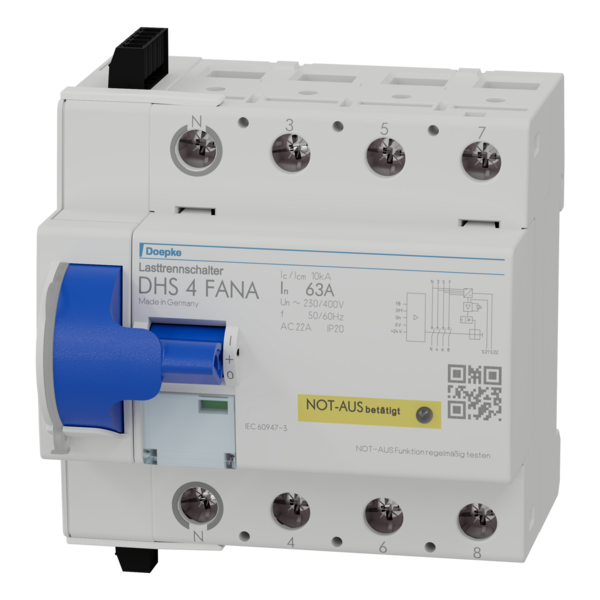 Los interruptores-seccionadores o los interruptores principales desconectan consumidores eléctricos o partes de la instalación por completo y en todos los terminales de la alimentación eléctrica. Además, también se conmutan bajo carga o en el caso de producirse una sobrecarga. Se utilizan para la desconexión a la hora de realizar trabajos de mantenimiento y también para proteger la instalación. Los dispositivos de la serie DHS 4 son interruptores-seccionadores o interruptores principales en versión de cuatro polos en los que el contacto N se conecta en el modo avanzado y se desconecta con retardo. Gracias a su diseño, se integran a la perfección en la estética de los interruptores diferenciales DFS. Los DHS 4 de la variante FANA permiten encender y apagar los dispositivos a distancia. Además, los elementos de accionamiento, como los pulsadores para desconectar el interruptor-seccionador en situaciones de emergencia, también pueden conectarse a través del módulo adicional compacto montado en fábrica. También es posible una conmutación en paralelo de varios DHS 4. El LED integrado en el interruptor-seccionador muestra tanto el disparo provocado por un elemento de accionamiento como una posible rotura de un cable. En tales estados, se evita una reconexión accidental del interruptor-seccionador.