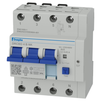 Los RCBO combinan la protección contra corrientes de defecto y la protección contra sobrecorrientes en un solo dispositivo (combinación de interruptor diferencial y magnetotérmico). Por lo tanto, son ideales para cuadros de distribución con espacio limitado. El poder de corte asignado de la serie DRCBO 4 es de 6 kA. Los interruptores de tipo de corriente residual B son sensibles a todos los tipos de corriente. La serie NK ofrece la protección contra incendios clásica de 300 mA en frecuencias de 0 a 150 kHz. Nuestros interruptores NK son ideales para la protección fiable de instalaciones con riesgo de incendio. Con la característica de disparo B, los interruptores garantizan una protección fiable para sus circuitos sin altas corrientes de conexión. Los dispositivos en versión estándar están diseñados para circuitos de 230 V o 400 V a 50 Hz.