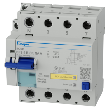 Los interruptores diferenciales de tipo B son sensibles a todos los tipos de corriente de falla. La serie SK garantiza una protección fiable con máxima disponibilidad de la instalación. Gracias a su baja sensibilidad de disparo a frecuencias elevadas, nuestros interruptores SK son perfectos para instalaciones que no requieren protección contra incendios. En los interruptores con configuración de parada de emergencia (NA), puede conectar pulsadores para una desconexión inmediata del suministro eléctrico. De este modo, puede reaccionar de forma rápida y precisa en caso de emergencia. El LED integrado indica en todo momento el estado del circuito de parada de emergencia. Nuestros interruptores en versión V están diseñados para tensiones especiales, para que también sus aplicaciones específicas estén protegidas de la mejor manera posible.