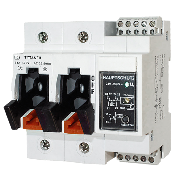 Los fusibles-interruptores-seleccionadores se desconectan y conmutan incluso bajo carga y protegen la instalación contra una sobreintensidad o un cortocircuito. Los dispositivos de la serie Tytan II son interruptores-seccionadores principales con fusibles para fusibles D01 y D02. Gracias a la técnica enchufable que no necesita tapones roscados, se garantiza la desconexión simultánea todas las fases. Al contrario de lo que ocurría con la tecnología de tapones roscados que se utilizaba antes, que no podía asegurar un contacto perfecto, la mecánica de esta serie evita el surgimiento de resistencias de paso grandes y, por lo tanto, reduce a un mínimo la cantidad de energía térmica disipada. Esta versión de los interruptores-seccionadores con fusibles con carcasa vacía dispone de una unidad de vigilancia para el fusible, que detecta cualquier fallo que pueda producirse en el mismo e identifica el estado mediante dos relés de señalización sin potencial, así como a través de dos LED situados en la parte delantera de la unidad. El dispositivo de vigilancia garantiza el funcionamiento trifásico y, de este modo, sirve como protección adicional, por ejemplo, en el caso de motores trifásicos. Los seccionadores en la versión de carcasa vacía se entregan con portafusibles para fusibles de hasta 63 A. Los portafusibles pueden cambiarse por otros de color que estén adaptados a la intensidad asignada. Las carcasas vacías deben equiparse con conectores de fusibles en la intensidad nominal requerida. Los fusibles defectuosos se indican mediante avisadores LED intermitentes.