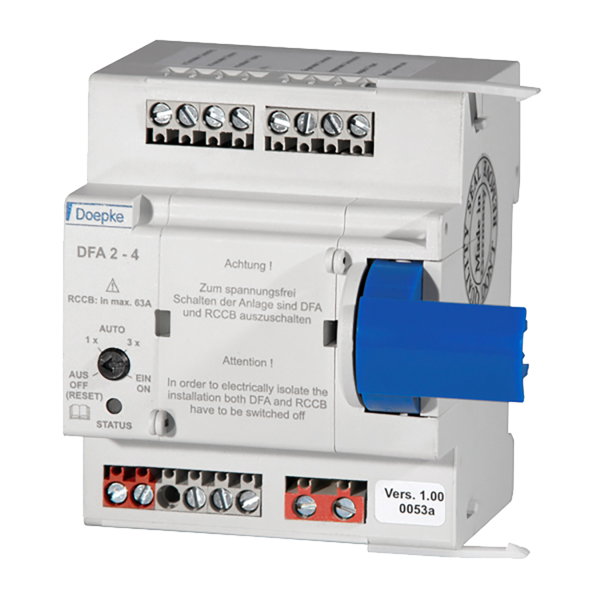Mit einem Fernantrieb (ARD) werden angeschlossene Fehlerstromschutzschalter aus der Ferne ein- und ausgeschaltet. Die Anlagenverfügbarkeit wird so deutlich erhöht. ARD mit Automatikfunktion schalten den Schutzschalter automatisch wieder ein. Bei einem erkannten Anlagenfehler erfolgt keine Wiedereinschaltung. Die Geräte dieser Baureihe schalten die Doepke-Fehlerstromschutzschalter DFS 2 und DFS 4. Je nach Ausführung machen die DFA drei, einen oder keinen Wiedereinschaltversuch. Sie werden linksseitig an den RCCB angesetzt. Fernantriebe dieser Ausführung schalten den Fehlerstromschutzschalter wahlweise ein- oder dreimal wieder ein. Die Wiedereinschaltung erfolgt 15 Sekunden nach Auslösung. Der Automatikmodus kann ausgeschaltet werden, z. B. zum Schutz bei Wartungsarbeiten in der Verteilung. Die Spannungsversorgung erfolgt mit 230 V AC. Zudem ist eine Fernauslösung durch eine Fehlerstromsimulation möglich. Die aktuelle Schaltposition des Schutzschalters ("eingeschaltet", "ausgelöst" bzw. "ausgeschaltet") wird durch drei integrierte Relaisschaltkontakte signalisiert. Der „Blockiert“-Zustand wird zusätzlich durch ein Relais signalisiert.