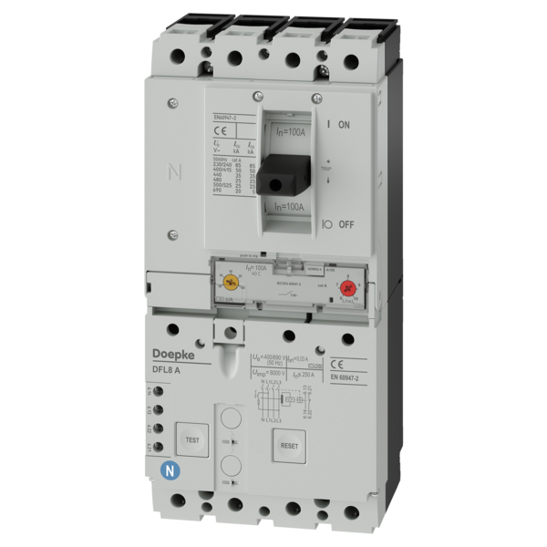 Leistungsschalter mit Fehlerstromschutz (CBR) schalten hohe Ströme, schützen Betriebsmittel, Kabel und Leitungen vor Überstrom und Personen vor elektrischem Schlag. DFL 8 sind kompakte Geräte mit integriertem Hilfsschalter und Anschlussklemmen für große Leitungsquerschnitte. Fehlerstromschutzschalter des Typs A sind puls- und wechselstromsensitiv. Schalter dieser Variante haben einen festen Bemessungsfehlerstrom von 30 mA für den Personenschutz. Sie gewährleisten somit den Fehler- und Brandschutz sowie den zusätzlichen Schutz (Personenschutz, Schutz bei direktem Berühren). Geräte in der Standardausführung sind für die Überwachung von Stromkreisen mit einer Bemessungsspannung von 400 V/690 V und einer Bemessungsfrequenz von 50 Hz ausgelegt.