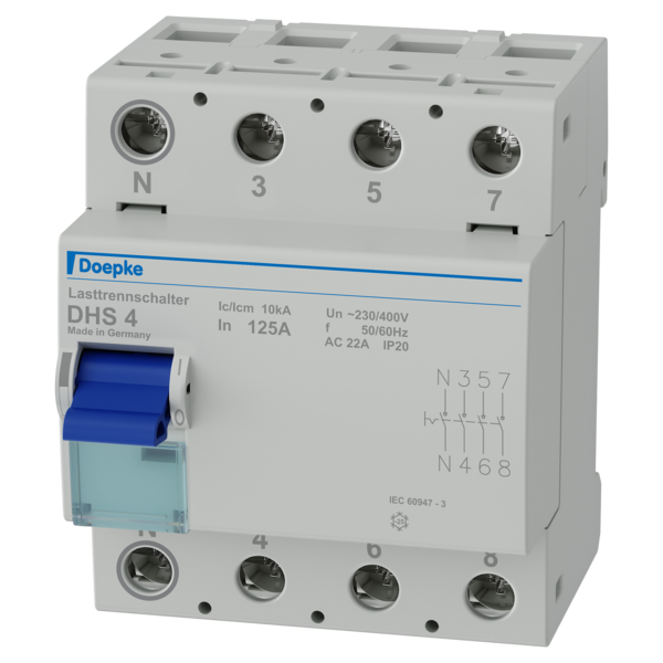 Lastrenn- bzw. Hauptschalter trennen elektrische Verbraucher oder Anlagenteile vollständig und allpolig von der elektrischen Versorgung. Sie schalten auch unter Last oder Überlast. Sie werden zur Abschaltung für Wartungsarbeiten und zum Anlagenschutz eingesetzt. Die Geräte der Baureihe DHS 4 sind Lasttrenn- bzw. Hauptschalter in vierpoliger Ausführung bei denen der N-Kontakt voreilend eingeschaltet und nacheilend ausgeschaltet wird. Durch ihre Bauart fügen sie sich hervorragend in die Optik der Fehlerstromschutzschalter DFS ein. Die DHS können durch einen Hilfs- bzw. Fehlersignalschalter erweitert werden, was die Anzeige und Weiterverarbeitung des Schaltzustands ermöglicht.