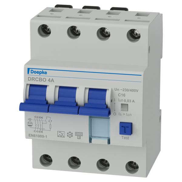 RCBO vereinen Fehlerstrom- und Leitungsschutzschalter in einem Gerät (FI-/LS-Kombination). Somit eignen sie sich ideal für Ihre Verteilungen auf engem Raum. Das Bemessungsschaltvermögen der Baureihe DRCBO 4 liegt bei 6 kA. Schalter des Fehlerstromtyps A sind puls- und wechselstromsensitiv. Mit der Auslösecharakteristik C gewährleisten die Geräte verlässlichen Schutz für Ihre Stromkreise mit Verbrauchern, die höhere Einschaltspitzen erzeugen. Geräte in Standardausführung sind für Stromkreise mit 230 V bzw. 400 V bei 50 Hz ausgelegt.